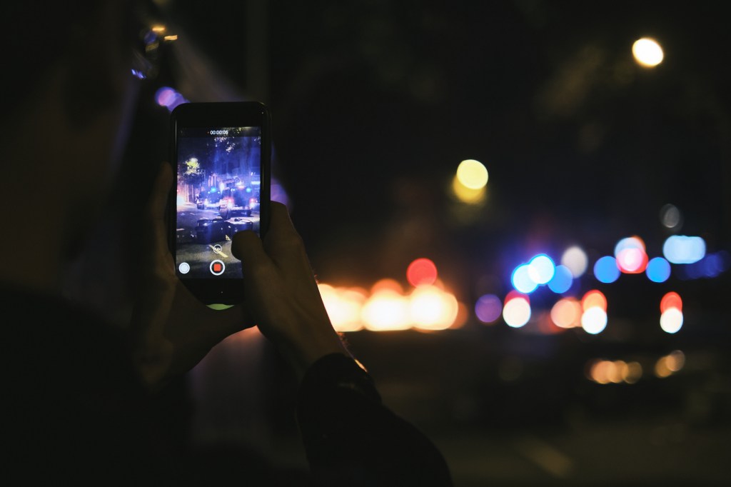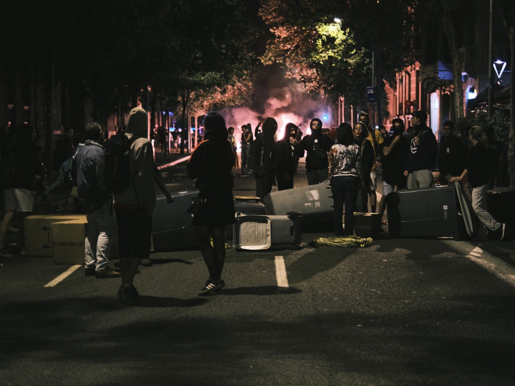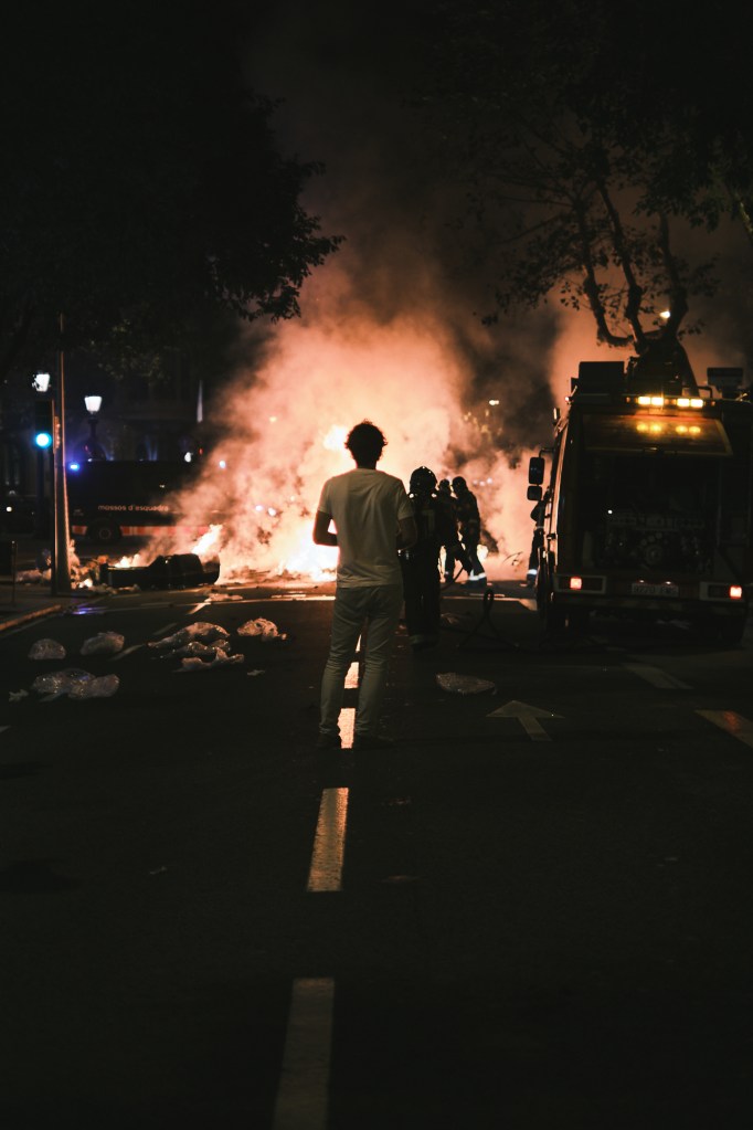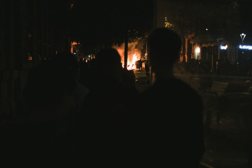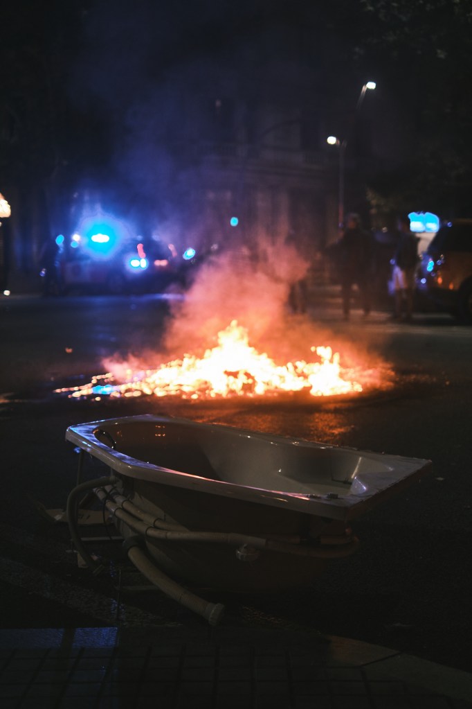 We stayed on the sidewalk close by the restaurant’s door in case we would need to find shelter. After about 10 minutes we got a little bit more (maybe a little bit too much) confident and started walking towards the fire. I was mindful to not get inside the crowds as I didn’t was to be mistaken for a protester having a camera in hand. Walking through the streets you could see down the road all the fires at every street corners, it was quite impressive.